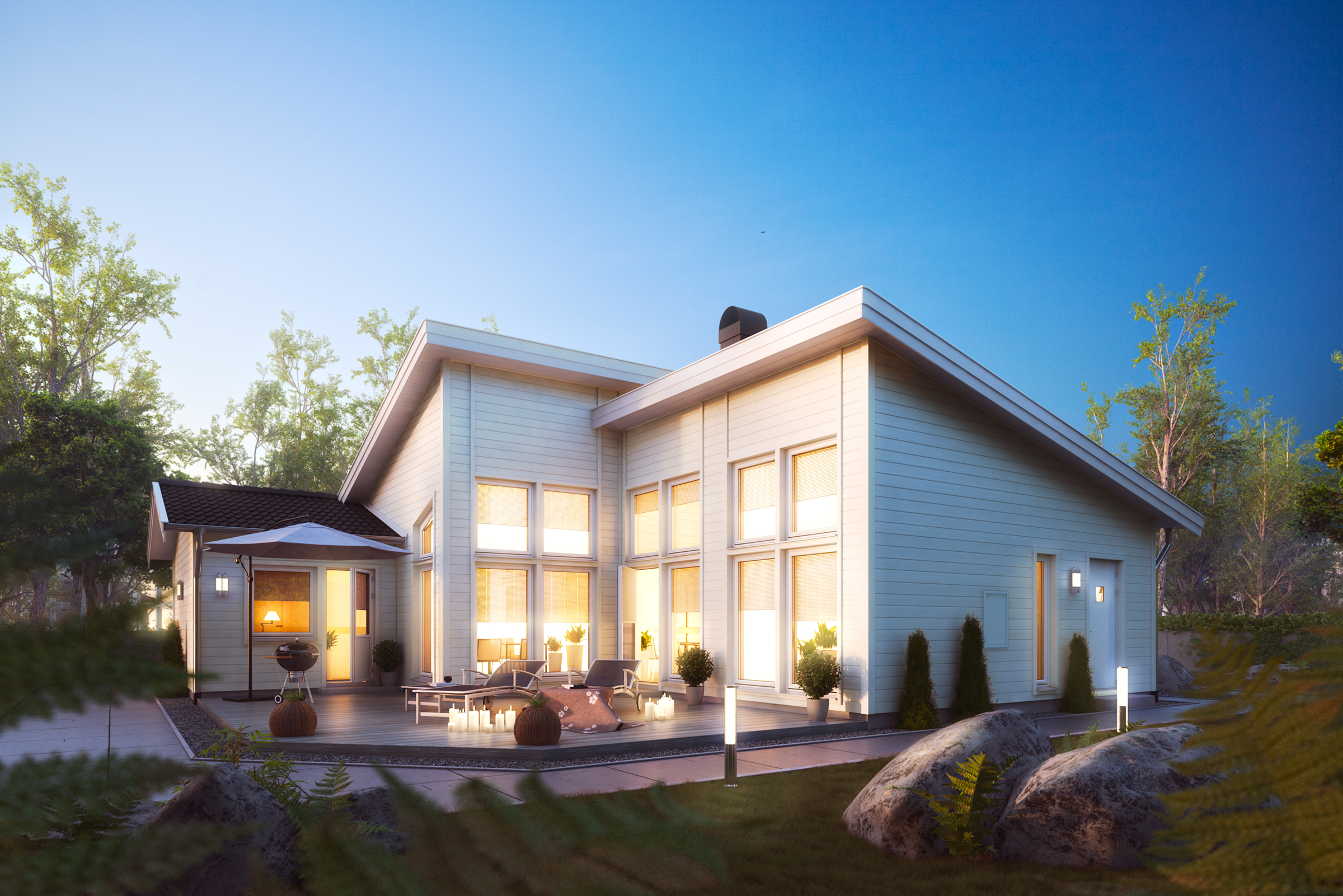 Almenäs ist ein elegantes und stilvolles Haus, das sich sehr gut für kleinere Grundstücke eignet. Die integrierte Garage bietet ausreichend Platz für zwei Autos und darüber hinaus Stellfläche für Fahrräder und Gartengeräte. Direkt vor der Längsseite des Bungalows lässt sich hervorragend eine Terrasse, im Windschatten der Garage, platzieren. Die zweite Terrasse ist überdacht und direkt vom Wohnbereich über die bodentiefen Fensterelemente zu erreichen.