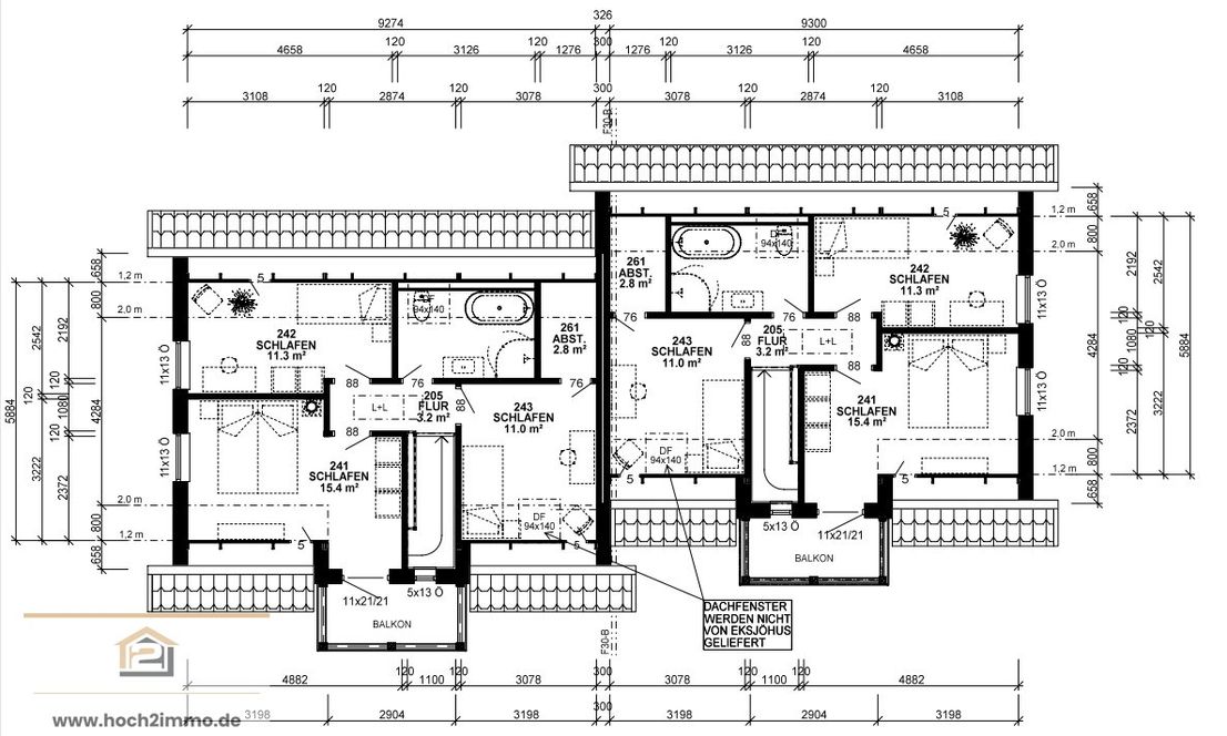 Die Ausführung erfolgt als Sparrendach, Kehlbalkendach oder Nagelbinderdach, je nach Haustyp, mit unterschiedlicher Dachneigung.